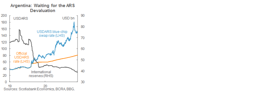 First, as we’ve argued extensively over the last few months, we’re not alone in expecting an ARS devaluation at some point in the remainder of 2020 or early in 2021. Recently monthly export numbers imply that producers have held back shipments abroad in the anticipation of a windfall from a significantly weaker ARS, as we noted in our November 26 Latam Daily. Although the blue-chip swap rate has pulled back from the extreme USDARS 180.73 level it hit on October 22 to USDARS 148.69 on November 27, it remains 54% weaker than the official USDARS 81.06 exchange rate (first chart). While we’ve programmed only a gradual depreciation in the official ARS over the coming months (see the Forecast Table on p. 2), this projection does not yet incorporate agreement on a set of policy measures to unlock new financing from the IMF. Despite various evolutions in the IMF’s thinking, particularly on fiscal policy where the Fund’s Managing Director is currently warning against too little rather than too much stimulus, it’s hard to imagine a scenario under which the release of financing under a new EFF arrangement won’t require an alignment of Argentina’s FX markets and, hence, a devaluation in the official Argentine peso.