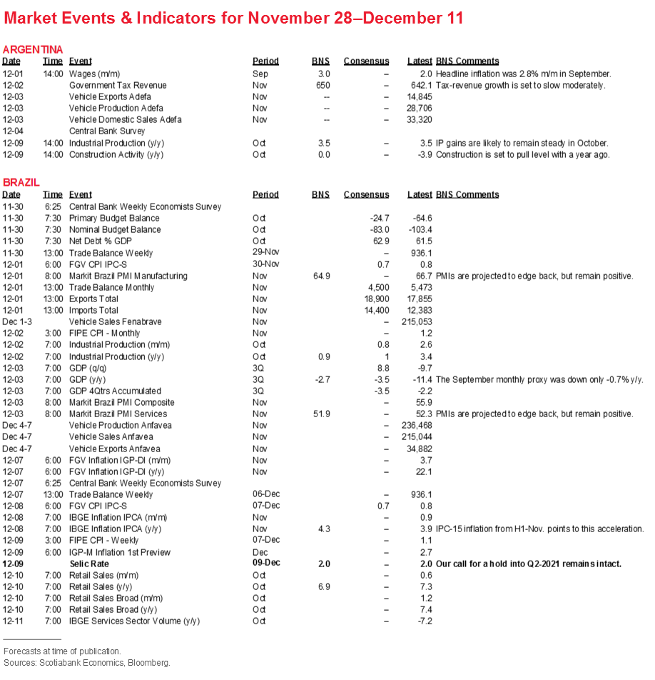 - Brazil. Q3 GDP (Dec. 3) should see economic activity up substantially from -11.4% y/y in Q2 to -2.7% y/y, while we expect monthly IPCA inflation (Dec. 8) to accelerate from 3.9% y/y in October to 4.3% y/y in November.