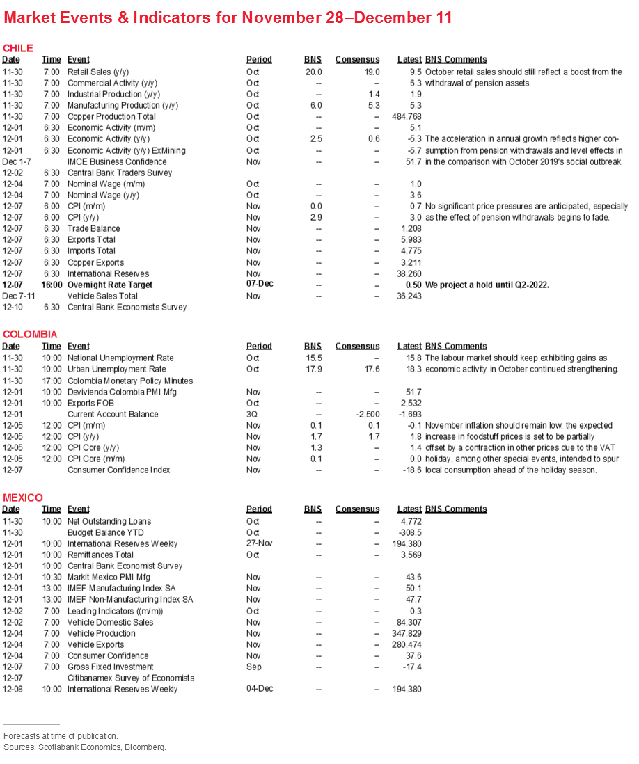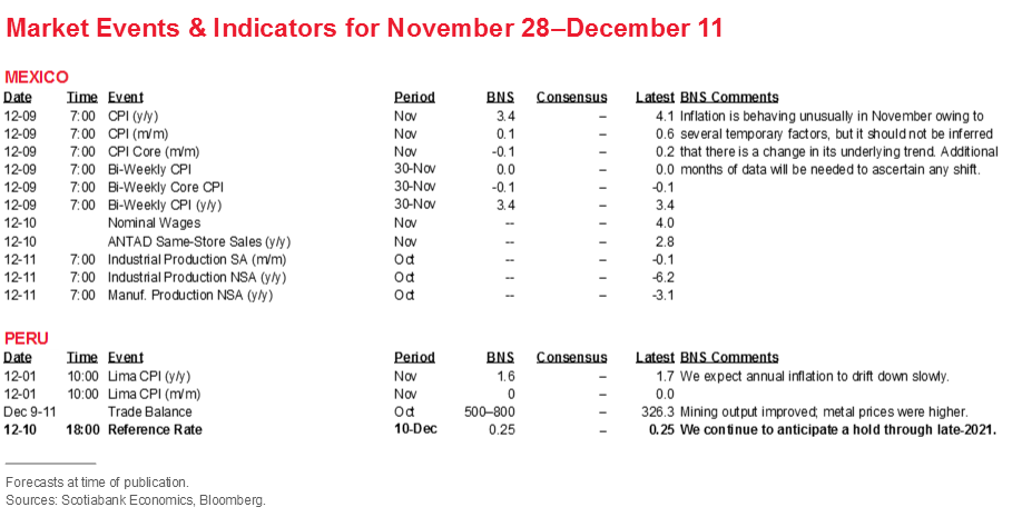 - Chile. October sectoral data (Nov. 30) and the IMACEC GDP proxy (Dec. 1) are expected to reflect boosts from the pension withdrawals, while November inflation (Dec. 7) is projected to edge down to just below the 3% y/y BCCh target.