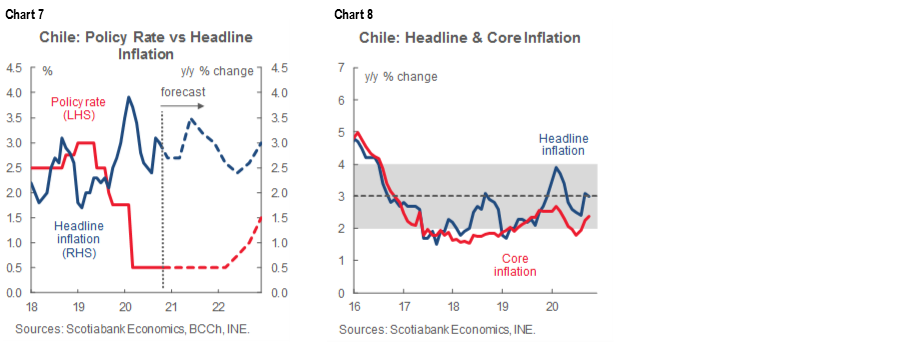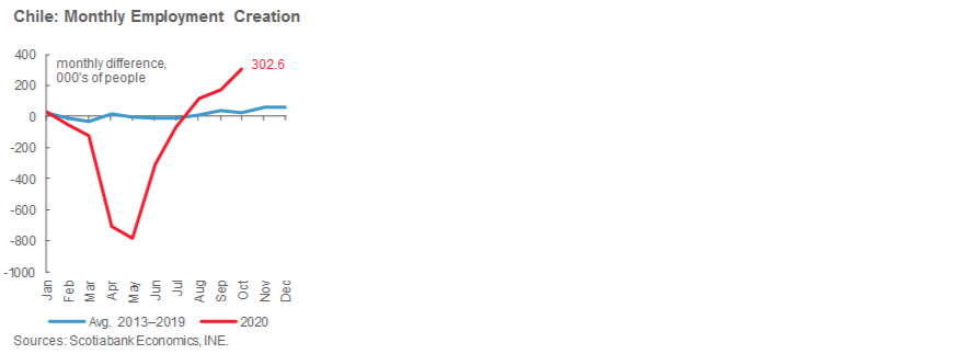 The fortnight ahead will bring some important data and events. First, on Monday, November 30, we will receive sectoral activity data for October. Our Scotiabank Chile transactions data point to retail sales being up 20% y/y in October after September was up 9.5% y/y. We anticipate that this jump was fueled by the withdrawal of pension assets and the low basis of comparison with last year, considering that in October 2019 we experienced the social outbreak in Chile. Manufacturing production should be up around 6% y/y in October. Next, on Tuesday, December 1, we will get the monthly GDP data for October, where we expect to see a rise of 2.5% y/y, the first annual increase since February. With more than 90% of the economy re-opened, we forecast a strong pick-up in non-mining activity (our projection: 2.5% y/y) and a decline of -1% y/y in mining activity. The October print will be the first instance where the central bank will publish the disaggregation of the monthly GDP proxy, with differentiated numbers on mining, manufacturing, commerce, services, and other goods.