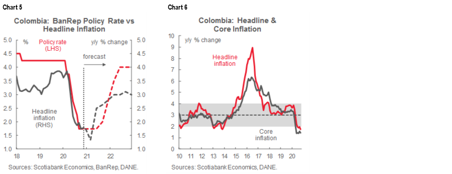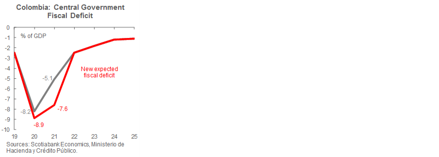 During the last month, Fitch and S&P maintained their investment grade (IG) ratings for Colombia, which added some confidence to markets in terms of fiscal sustainability. However, they also kept a negative outlook and conditioned Colombia’s future IG status on tax reform that generates enough resources in the medium-term to start to reduce or at least stabilize the debt-GDP ratio. In fact, recently the Ministry of Finance strongly underscored the need to pass a substantial tax reform as soon as in H1-2021 while, at the same time, it increased the already-high fiscal deficits projected for this year and 2021. This year, the fiscal deficit is projected to be equivalent to -8.9% of GDP instead of the -8.2% under previous forecasts, and next year -7.6% instead of -5.2%.