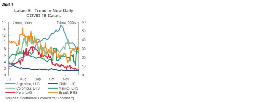 In COVID-19 developments, Latam continues to fade a bit from the spotlight as governments pursue the outer stages of economic re-opening and new case incidence numbers surge elsewhere. Per-capita new case numbers in the four Pacific Alliance countries (i.e., Chile, Colombia, Peru, & Mexico) are only an eighth of those in the US and half of those in Canada. Argentina is steadily bringing its southern-winter surge down (chart 1), but new incidences in Brazil and Mexico, where controls have always been loosest in the region, are on a new path upward (chart 1, again).