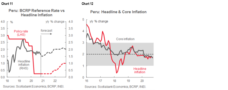 - Peru. The BCRP Board will make its last planned rate decision for 2020 on Thursday, December 10, where we expect the headline policy rate to be held again at 0.25% (chart 11). The meeting is likely to be uneventful, with the BCRP focused on efforts to mitigate volatility in the PEN and ensure major sectors of the economy continue to be able to access adequate liquidity. We expect below-target inflation (chart 12) to soften only marginally further into the end of the year.