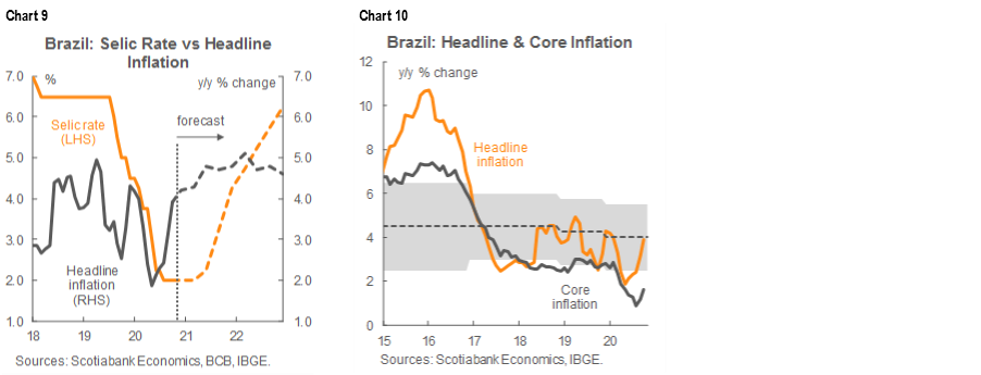 - Brazil. The BCB’s Copom is next scheduled to meet on Wednesday, December 9, where our Brazil economist expects the Selic rate to be held at 2.00% for a fourth meeting in a row (chart 9). In view of the boost to our growth and inflation projections in the Forecast Update on p. 2, we no longer see a strong chance of additional easing at this stage, but as we acknowledge in the Central Bank table on p. 3, there is a material risk that hikes could be brought forward earlier than the first move we anticipate in Q2-2021 in an effort to shore up the BRL and respond to rising inflationary pressures (chart 10). While markets are also pricing a hold on December 9, they do anticipate a first hike in Q1-2021. Following its usual calendar, the minutes from the Copom’s meeting are due to be published on Tuesday, December 15.