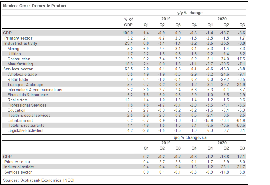 We also received the detailed figures on Gross Domestic Product (GDP) in Q3, which were very much in line with the advance reading provided by INEGI a few weeks ago (see the table). The numbers depicted a rebound at contrasting speeds from the bottom recorded in Q2 due to COVID-19 confinement; while industry grew 21.7% q/q sa, services increased by 8.8% q/q sa. Within the services sector, there were also mixed results across sub-segments, with some of them recovering relatively quickly, such as commercial activities, and some deteriorating, like media and information services and professional services. Other sectors such as entertainment, restaurants and hotels, and transportation services, remained seriously impaired.