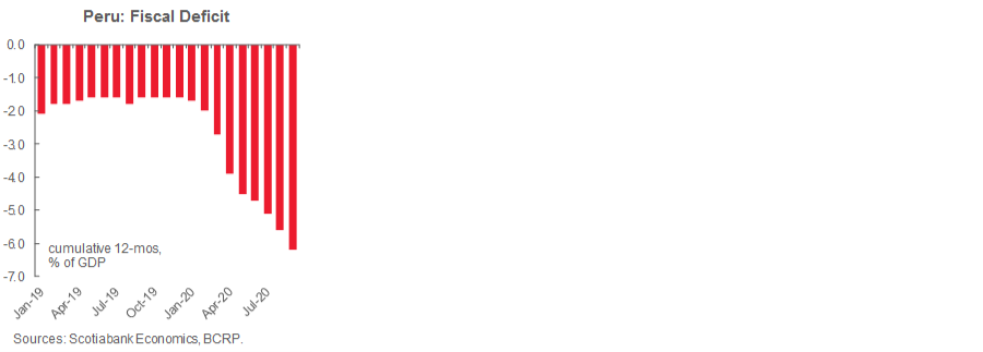 The Ministry of Finance (MEF) is expecting a fiscal deficit equivalent to -10.7% of GDP in 2020 and -6.2% in 2021. Both are higher than our forecasts of -8.7% and -5.0%, respectively. The difference is that we are less confident in the ability of the government to increase spending as much as it would like; the trend so far this year is closer to our forecast. The fiscal deficit in the four quarters to Q3-2020 came in at -6.2% of GDP. Note, however, that there is room for optimism, as both the MEF forecast and our own are based on metal price expectations that appear quite conservative when compared to their trends over the past few months.