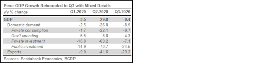 The BCRP released Q3-2020 GDP numbers on Monday, November 23. GDP contracted -9.4% y/y in Q3, although this included a significant 30% month-on-month increase on its front end. The breakdown makes the fourth quarter look promising. Private sector investment fell -7.1% y/y, which was a surprisingly strong rebound from -60% y/y in Q2. This should carry into Q4. Furthermore, public investment, which contracted -24.5% y/y in Q3-2020, is finally adding to growth, rising 6.6% y/y in October, and an expected 25.7% y/y in November. Exports, which fell -23.2% y/y in value in Q3, should also improve, as copper mining output returns to pre-COVID-19 levels, and fishing surpasses last year’s dismal season. At the same time, COVID-19 has subsided significantly, and the economy is nearly completely unlocked.