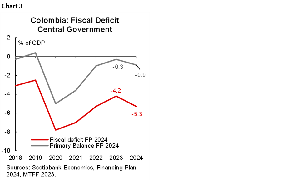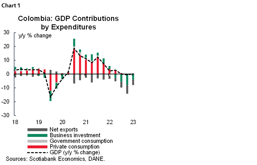 Colombia’s macro picture is far from being simple; economic activity delivered a negative surprise in 2023, posting a weaker-than-expected GDP growth of 0.6% that reflected a significant moderation in the domestic demand (chart 1), going from an expansion of 7.6% in 2022 to a moderate 2.3% growth in 2023, especially amid a deceleration in private consumption, passing from an expansion of 9.4% in 2022 to 1.2% in 2023, and a significant contraction on investments (-26.0% in total investments including inventories changes), all in a context in which the public sector wasn’t effective in implementing the fiscal budget. The previous picture was revealed on February 15th, and since then, many relevant actors in the economic scenario have highlighted the need of better and sharper action from policymakers, emphasizing that the main target currently should be to make the Colombian economy achieve a recovery and high quality path for economic growth to make it sustainable. In fact, this is also a medium-term concern for the credit rating agency S&P. That said, amid recent economic data at Scotiabank Colpatria Economics, we revised the GDP growth forecast for 2024 to 1.4% as private consumption is expected to recover in the second half of the year, while the recovery in investment is expected to start due to an increase in inventories in the H1-2024, while in the H2-2024, we expect a better contribution from private projects.