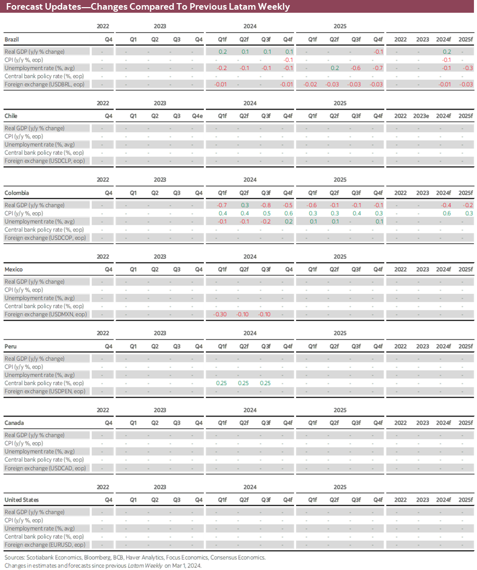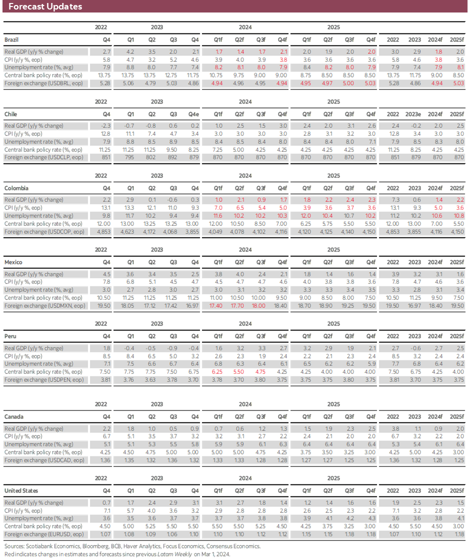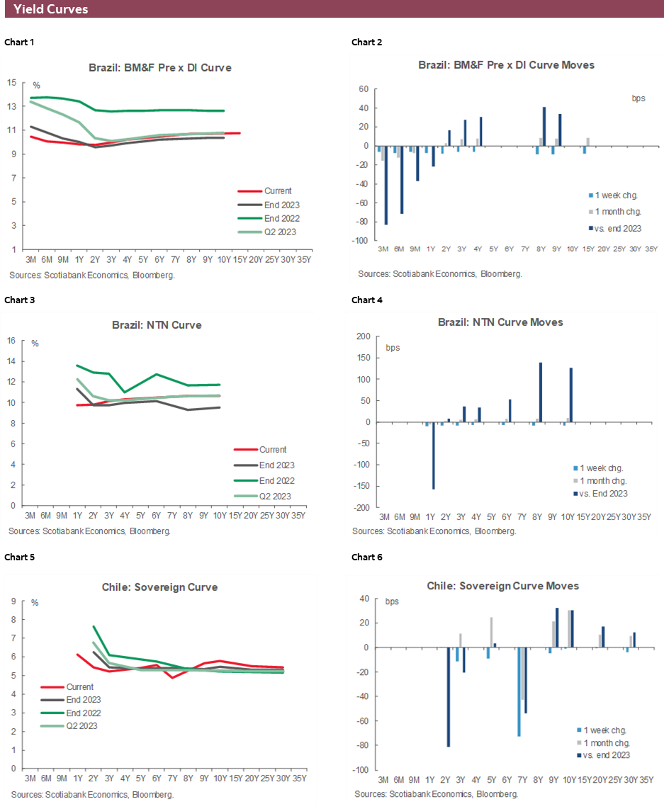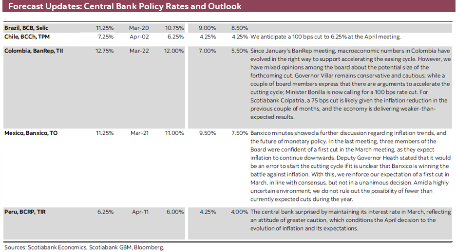 After a packed week in the Pacific Alliance, we now have a relatively quiet few days where comments by regional central bankers may be an important risk for local traders unsure about upcoming policy announcements. Our economists’ calls of respective 75bps and 100bs cuts by BanRep and the BCCh at their upcoming decisions were challenged by above consensus inflation data that raise the odds of smaller moves—and, accordingly, our Chile colleagues now see ‘only’ a 75bps move next month.