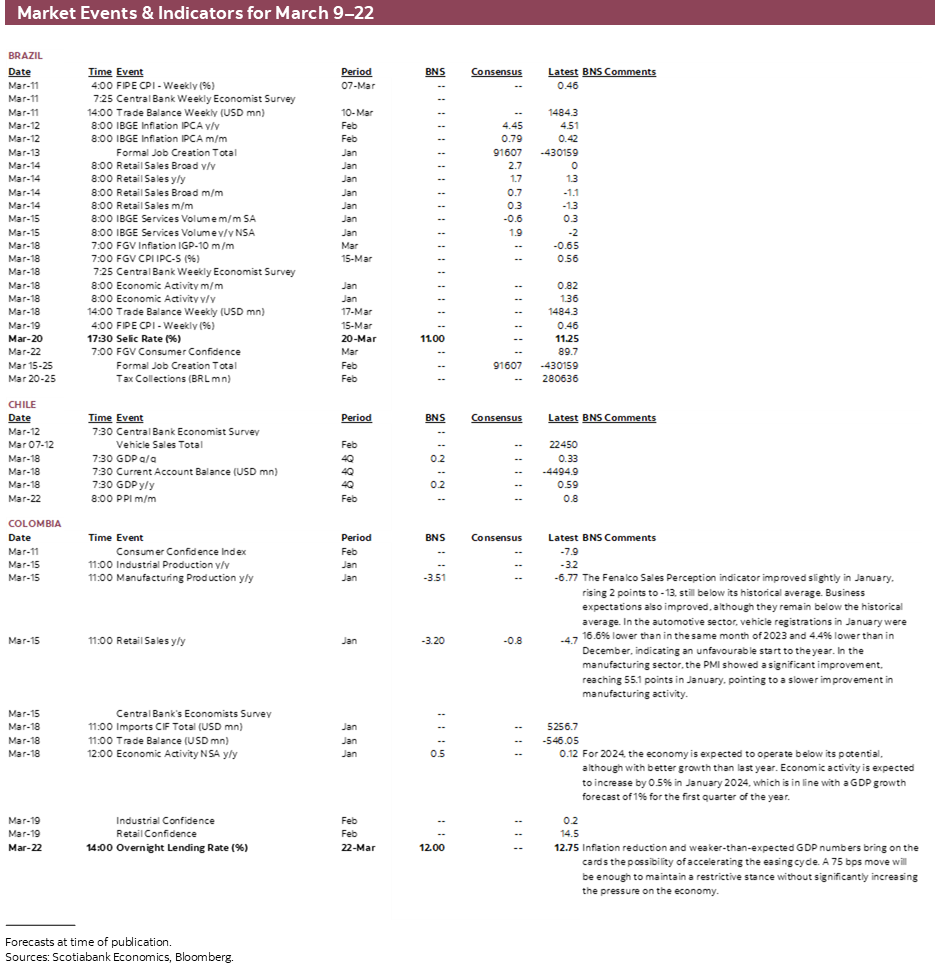 Brazil’s IBGE is the last of the key countries in the region to release CPI data for February, on Tuesday, with economists expecting a modest deceleration in headline inflation in year-on-year terms, but with monthly headline and core inflation picking up which may add to the idea that the BCB will soon shift to a lower pace of cuts—at one of its May or June decisions. Retail sales and services volumes data are also on tap.