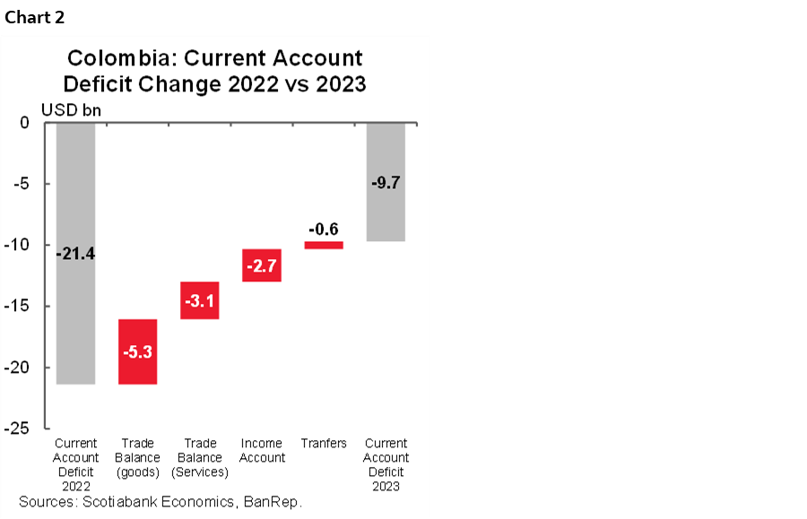 Economic activity deceleration drove an important reduction in the current account deficit, which fell from USD 21.4 bn in 2022 to USD 9.72 bn in 2023 (~-55% y/y), which as a proportion of GDP represents a reduction from 6.2% deficit to a deficit of 2.67% of GDP, the main driver in the deficit reduction was the lower trade deficit of goods (chart 2), in which the contraction in imports (-17.1% y/y) outpaced the contraction in exports (-11.7% y/y). That said, the external deficit mirrored the weakening of domestic demand and contributed to moderate FX upside pressures observed during 2022 when the economy exhibited a strong activity that was also reflected in historically high imports. Ahead of 2024, the current account deficit is projected at 3.5% of GDP (~USD 13 bn), which will be compatible with a mild recovery in domestic demand and the increase in international purchases to rebuild inventories.