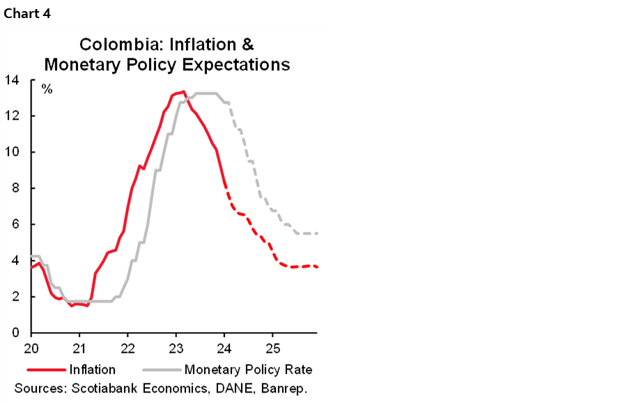 In the previous context, the favourite word for BanRep is ‘caution’. Inflation is still well above the target while the economic activity reflects in part a desired deceleration but also a concern about investments. A couple of BanRep’s board members said they are considering accelerating the easing cycle, while Governor Villar continues to lean to the conservative side. The Finance Minister has mentioned that he will vote for a 100bps rate cut to avoid a significant spike in the real rate. At Scotiabank Colpatria, we project a 75bps rate cut, which will maintain the monetary policy rate at a restrictive territory but avoid putting more pressure on the economy than necessary. If our scenario materializes, the rate-cutting cycle will stimulate a gradual economic recovery during H2-2024 (chart 4).