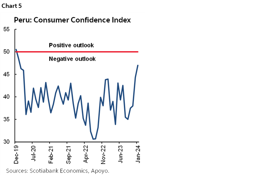 Where there may be some upside to our GDP growth estimate is if the impact of public investment on construction is greater than we are expecting, or if the celerity of the rebound in domestic demand occurs faster. On this score, it’s interesting to note that the consumer confidence index improved to a four-year high in January–February. It’s still negative, but it’s the least negative it has ever been since the Covid pandemic started. You can probably thank low inflation for that (chart 5).