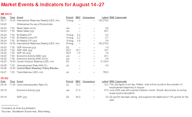 - A comprehensive risk calendar with selected highlights for the period August 14–27 across the Pacific Alliance countries, plus their regional neighbours Argentina and Brazil.