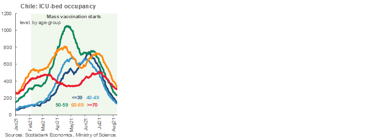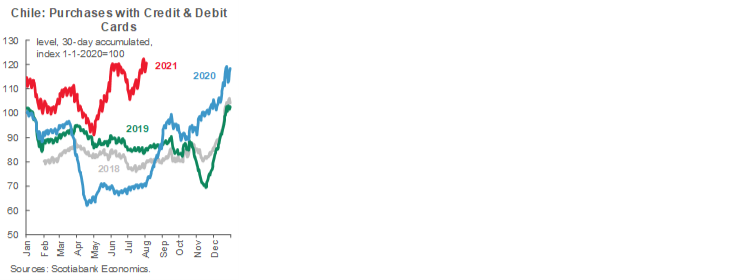 On a positive note, on July 30, the INE reported a drop in the unemployment rate to 9.5% in the quarter that ended in June, better than expected by the market and Scotiabank (10%). Moreover, on August 2, the BCCh released the June monthly activity index (Imacec), which expanded 20.1% y/y, marginally exceeding private sector expectations. These encouraging figures are the product of a few specific ingredients: greater openness and mobility, a very strong expansion of public spending on direct transfers to households, and capital spending in conjunction with liquidity injections from withdrawals of pension funds. The latter has boosted the GDP growth of the trade sector, which expanded 46.4% y/y in June.