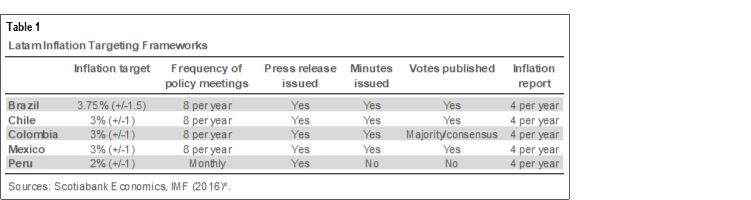 These central banks have benefited from the adoption of inflation targeting regimes (table 1). Key elements of those frameworks include the inflation target to be pursued as well as transparency and accountability measures. The latter are critical to anchoring expectations: inflation targeting central banks that consistently meet their targets will steadily build credibility. This credibility, once secured, allows the central bank to achieve its target with lower output losses in the face of inflation shocks. In the current conjuncture, rate hikes by central banks in Brazil, Chile, Mexico and Peru likely reflect concerns that their hard-won credibility could be eroded if temporary increases in inflation are allowed to bleed into expectations of higher future inflation.