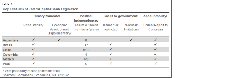 Inflation targeting frameworks also require sound legislative foundations (table 2). Foremost among these foundations is a price stability mandate as the primary objective of monetary policy. This specification recognizes that with limited policy tools at its disposal a central bank that tries to achieve too many objectives may be unsuccessful in meeting any. Central banks in Brazil and the Pacific Alliance countries all have legislated price stability mandates. Argentina, in contrast, adds an economic development mandate, creating the potential for the central bank to deviate from inflation control in pursuit of development objectives.