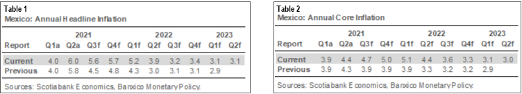 The governing Board mentioned that global inflation and the effects on supply chains and production processes have fueled headline and core prices, causing inflation expectations in 2021 to rise again. Headline inflation is now expected at 5.7% y/y for year-end, revised up from 4.8% y/y in the latest Quarterly Inflation Report but inline with the Scotiabank forecast of 5.7% y/y (table 1). Given the broad-based inflation pressures, with energy price declines—driven by base effects—offset by food inflation, rising correlations in merchandise price inflation, and earlier than expected services inflation, prices are now expected to converge to the 3% target by the first quarter of 2023 (from 2022 Q2 the previous meeting), signalling a more hawkish tone. Core inflation has also been revised up across the forecast horizon (table 2).