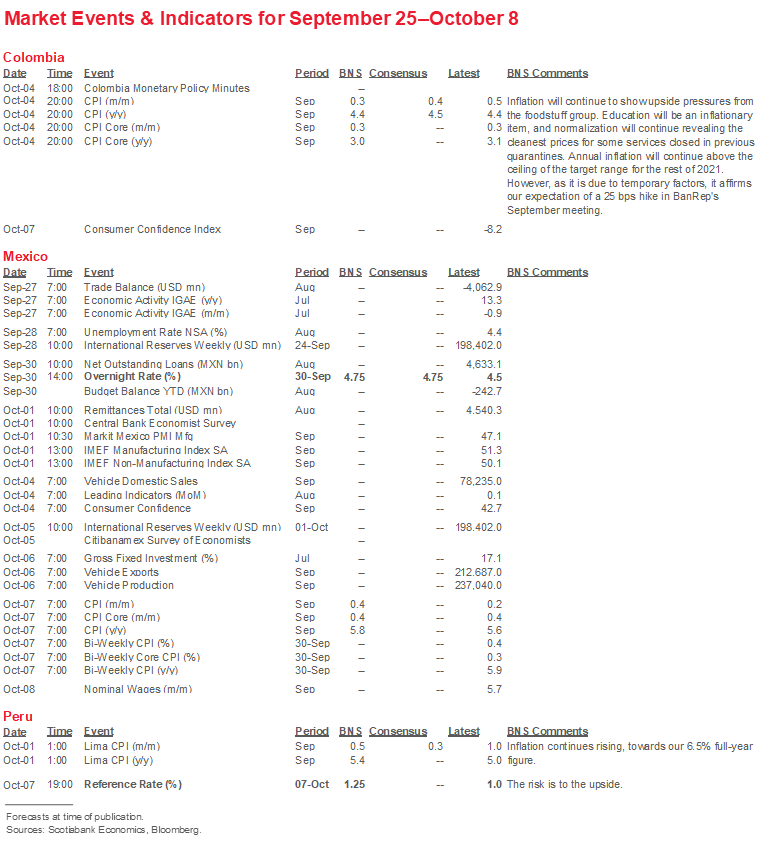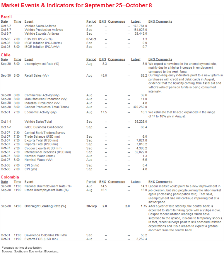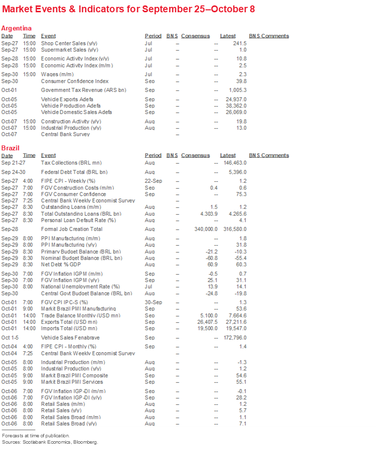 - A comprehensive risk calendar with selected highlights for the period September 25–October 8 across the Pacific Alliance countries, plus their regional neighbours Argentina and Brazil.
