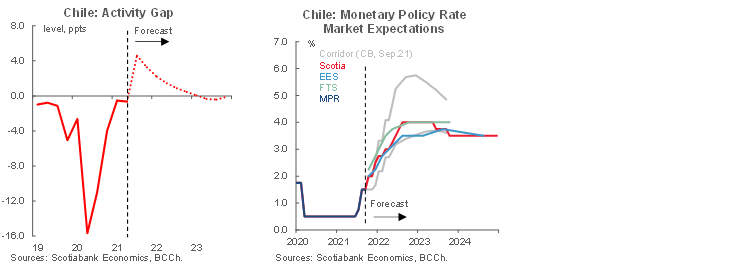 On Wednesday, September 15, the central bank (BCCh) released the Minutes of its last Monetary Policy Meeting in which the Board decided to increase the Monetary Policy Rate 75 basis points (bps). According to the Minutes, a critical argument behind the decision was that the current degree of monetary stimulus was not commensurate with an economy that grew at double-digit rates and that had already closed the activity gap (first chart). Given this argument, the BCCh will probably consider rate hikes of between 50–75 bps in October and December. In this regard, the BCCh’s baseline scenario reveals a Monetary Policy Rate (MPR) that will increase rapidly to its neutral level towards the first quarter of 2022 (3.5%), rising above this level towards the second quarter of next year (second chart).