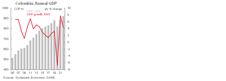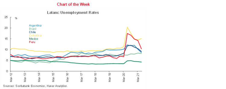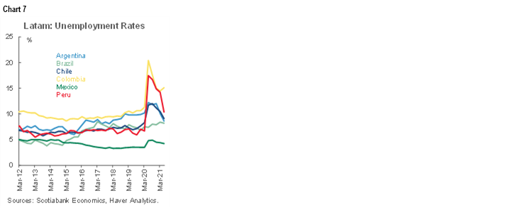 Less progress has been made in terms of labour market recovery. Despite sharp drops in a few countries, and more gradual declines in others, unemployment rates remain above March 2020 levels in most countries of the region (chart 7). The divergence in employment and output responses leads Scotiabank’s team in Bogota to examine the Okun relationship between the two (see the discussion below). Such considerations could militate for patience and slower pace in central banks’ monetary tightening cycles.