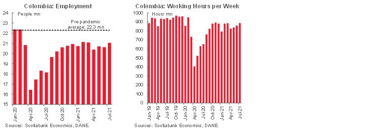According to the most recent DANE release, economic activity in July reached pre-pandemic levels (first chart). It is noteworthy that the services-related sector had the strongest performance, even with some activities still operating under capacity. The strong pace of economic activity leads us to revise up our GDP forecast. We now expect an expansion of 8.2% in 2021 and 4.4% in 2022 (chart 1).