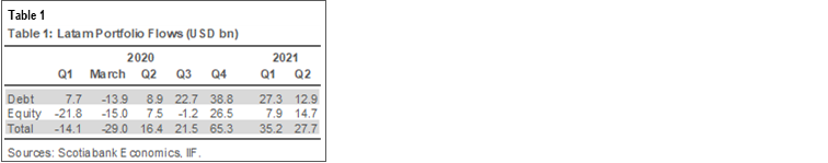 Latam markets experienced a sudden withdrawal of capital in March 2020 as investors sought safe havens in the face of unprecedented uncertainty. Although those outflows were quickly reversed as markets calmed and investors reassessed risks, the episode highlights the potential dangers that could lie ahead. Steep currency depreciations triggered by large outflows raise the specter of pass through effects on inflation as higher import prices on foodstuffs and key inputs feeds through into other prices. Such effects have declined over the past two decades or so as inflation-targeting regimes have gained credibility, but the 2016–17 experience shows that it remains an important consideration with respect to inflation expectations and monetary policy decisions. As the discussion by Scotiabank’s experts in Lima below highlights, such considerations may be especially relevant with respect to Peru.