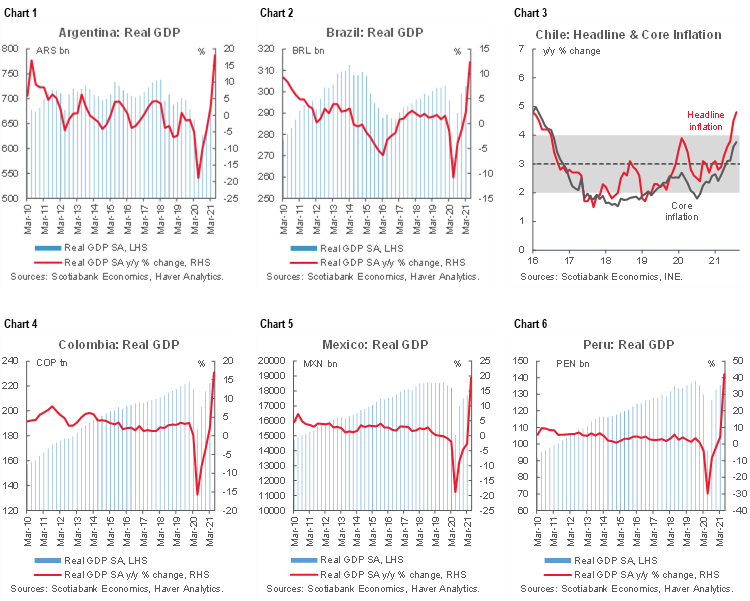 Across the Latam region economic recovery output is returning to pre-pandemic levels (charts 1–6). In Chile and Colombia, output has closed the gap.