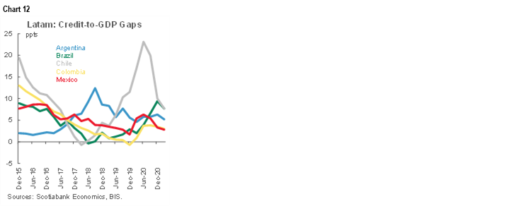 Private non-financial sector balance sheets are also a potential concern. The low interest environment that followed the global financial crisis animated a build-up of leverage in private sector balance sheets globally. One way to assess this build-up is to look at credit-to-output gaps that measure the extent to which increases in credit outpace the underlying growth in GDP. While there is no reason to believe that credit and output should grow in lock step year-in, year-out, persistent increases in credit that outpace GDP (on which debt servicing capacity rests) could be an early warning indicator of possible problems. In this respect, there is some evidence of such gaps across the Latam region over the past decade, though such effects have moderated more recently (chart 12).