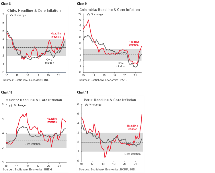 - Latam central banks have embarked on a tightening cycle designed to prevent temporary price shocks from becoming embedded in inflation expectations.