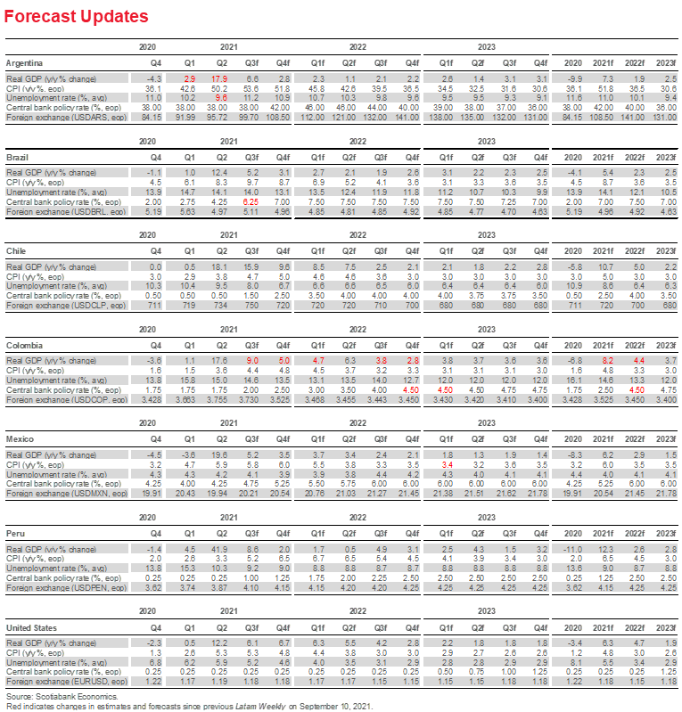 In the short-term, inflation will likely track close to 5%, although we think that the current price shock is temporary. However, as we explained in the previous Latam Weekly, prices dynamics are sufficiently concerning to motivate a hawkish bias in the central bank’s hiking cycle. That said, we expect a 25 bp rate hike in each possible meeting in 2021 and 2022, as reflected in our revised forecast of the monetary policy rate for Dec-2022 of 4.50%, up from 4.0%. At that point, we expect the Colombian economy to consolidate better growth numbers with inflation hovering around the 3%.