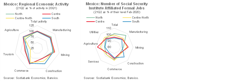 The second consideration, which in our view may be more important, comes from the nuanced evolution of the domestic economy. It is true that not all sectors in an economy return to potential or full capacity at the same pace, leading to possible supply shortages of key inputs. But price pressures in a complex and integrated supply chain—or within a more economically complex region—can generate more distortions and confusion with respect to overall output and prices than a marginal sector or region. It is worth noting, therefore, that strategic sectors such as manufacturing and more economically complex regions of the country—such as the North and the Bajio—are much further along in their recovery process than sectors with less complex supply chains and regions, such as tourism and the South (first and second charts). This observation weakens the dovish camp argument that supply-side shocks are driving the increase in inflation. Moreover, outside the South of the country, formal employment in most sectors is now above pre-pandemic levels. With this in mind, we think price pressures are not only the result of input shortages and commodity price reflation but are also fueled by underlying growth.