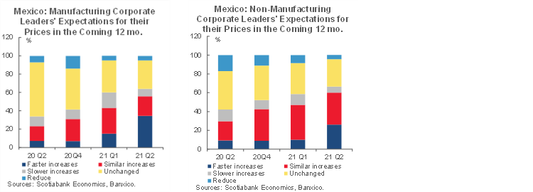 In this context, we think it highly relevant that in a survey published last week by Banxico in its Report on Regional Economies a majority of company executives in both the manufacturing (third 3) and non-manufacturing (fourth chart) sector expected to increase their prices over the next 12 months at the current or faster pace (55.7% and 60.1%, respectively). In our view, this reflects contamination of prices, as well as an increase in pricing power for firms that have been dealing with a contracting economy for the past two years. In industries with tight supply chains, in which firms have faced two years of flat or negative growth, demand is picking up fast, and firms are experiencing faster producer price increases (PPI inflation in Mexico started rapidly accelerating in the summer of 2020); it is not a surprise that companies plan to increase prices.
