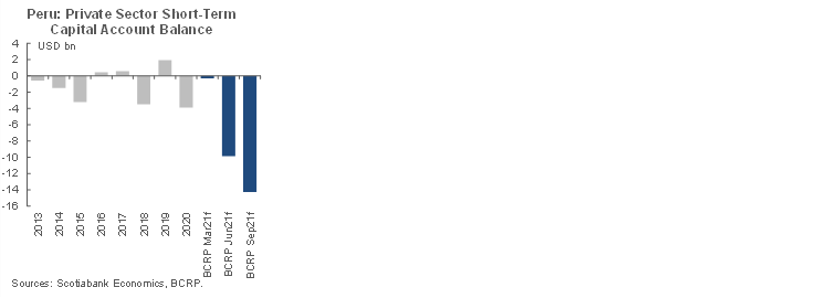 Overall, there is still little evidence that political turbulence is having much of an impact on growth. The same cannot be said for some of the financial indicators. The most dramatic is the outflow of short-term capital (first chart). The BCRP now expects a huge USD 14.3 bn of short-term capital outflow in 2021. This is up from its previous forecast of USD 9.9 bn, and from the forecast at the beginning of the year, which was barely USD 300 mn. The BCRP may fall short yet again, as the outflow in the first half of the year was USD 13 bn. The figure is over triple the previous record outflow.