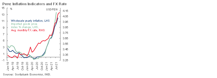 The third quarter started out with robust GDP growth of 12.9% y/y in July. This represented 0.4% growth versus pre-lockdown July 2019 levels, and 0.2% in month-on-month terms. It is also in line with our full-year 12.3% forecast. The BCRP raised its forecast, in its quarterly inflation report, from 10.7% GDP growth for 2021 to 11.9%, drawing nearer to our own.