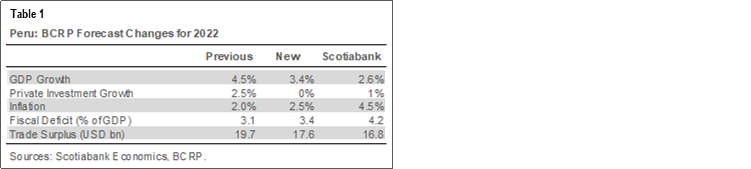 All this suggests that the BCRP is uncomfortable with the idea of adopting an aggressive reduction in monetary stimulus going forward. However, in practice, the BCRP has been taking its policy decisions based on the data as it has become available, raising the reference rate, not so much in anticipation of rising inflation going forward, but in reaction to recent past inflation data as it has emerged. Given that we expect inflation to rise at a greater pace than the BCRP (4.5% in 2022, versus 2.6% for the BCRP), we believe the BCRP will continue raising its reference rate, to at least 2.5% in 2022, if not more (table 1).
