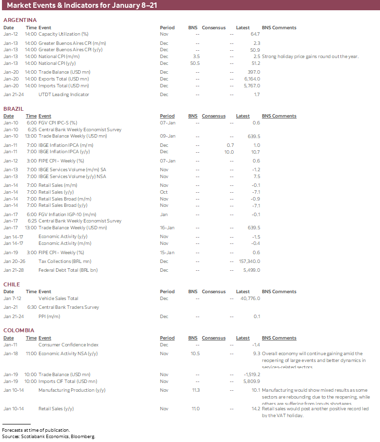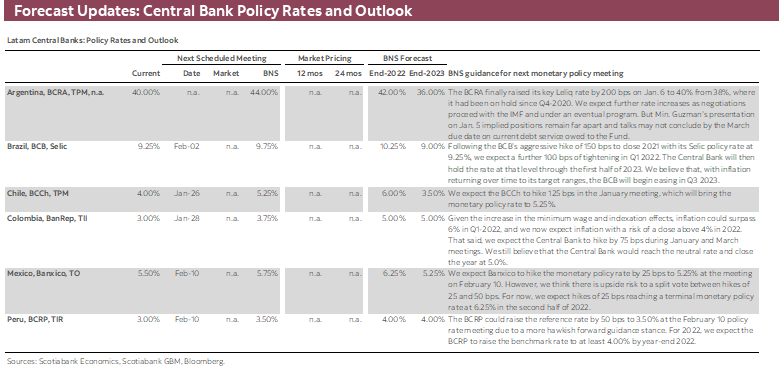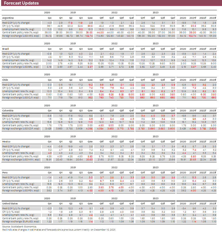 - Rising COVID-19 caseloads from the omicron variant increase the uncertainty with respect to short-term forecasts. For now, however, Scotiabank teams in the Latam region do not anticipate large revisions; recent changes reflect new data and not a change in view. See the full set of projections in the forecast table below.
