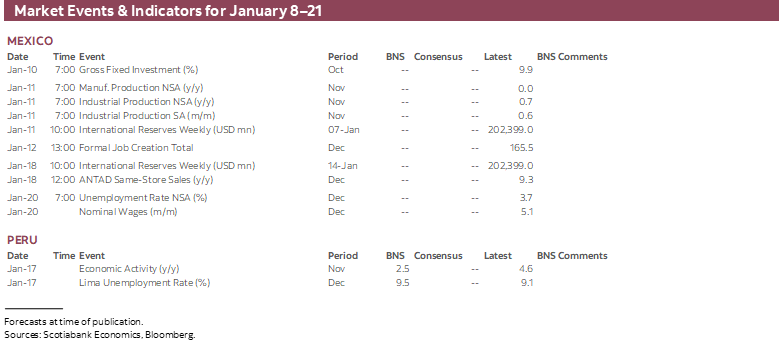 - A comprehensive risk calendar with selected highlights for the period January 8–21 across the Pacific Alliance countries, plus their regional neighbours Argentina and Brazil.