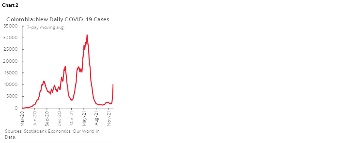 After the strong third wave in mid-2021, infections started to increase late in December. Daily COVID-19 cases stayed below two thousand; however, infections increased after omicron was identified, and new daily cases now number around 12 thousand (chart 2). The government projects that by February Colombia could face new case levels similar to those of the third wave (between 30 and 40 thousand daily cases). For now, mortality rates remain subdued and, at roughly 50 persons per day, are at levels registered in the calmest months of the pandemic. Some companies are opting again for remote work arrangements, while schools are expected to fully return to classes by the end of January. Some traditional festivals were cancelled or partially restricted, which would impact business in small cities.