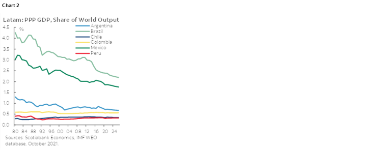 The region was less exposed to the financial dysfunction propagated by the financial excesses in advanced economies, which erupted in the subprime crisis in 2007, while strengthened policy frameworks allowed counter-cyclical policy responses that partially offset the effects of the crisis. Nevertheless, the sharp contraction in advanced economies led to the loss of external demand and worsened the region’s terms of trade, taking a toll on Latam growth. That said, external factors do not account for the fact that the region hasn’t increased its share of global GDP measured in purchasing power parity (PPP) terms (chart 2).