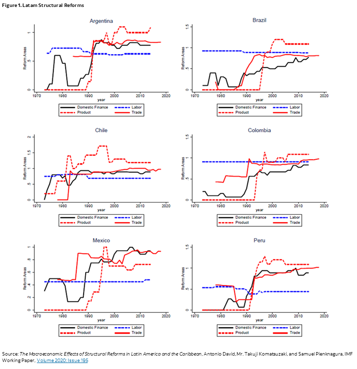 For most Latam countries, the 1990s was an important era of growth. It featured an unprecedented wave of structural reforms (Figure 1, see below) that liberalized economies and fostered robust expansion. While some of that growth can be attributed to the recovery from the “lost decade” of the 1980s, there is little debate that structural reforms facilitated the reallocation of resources from low-productivity activities to high-productivity activities and enhanced growth prospects in the region. That progress is evident in the data on GDP per capita (chart 1), which picked up after 2000. (Chile, which implemented reforms earlier, led other Latam countries in this respect.) Not all countries have reaped the same benefits from reforms, however, with most Pacific Alliance countries outperforming other regional partners.
