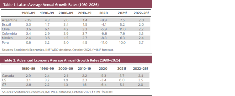 That would be welcomed news with which to start the new year. Across the Latam region, countries staged impressive recoveries in 2021, with output returning to pre-pandemic levels in most. And looking ahead, Scotiabank economists see robust—albeit lower—growth continuing into 2022 and beyond (see forecast table above). If global growth continues unimpeded, with recovery progressing in advanced countries, generating export opportunities, a favourable external environment should support this outlook.
