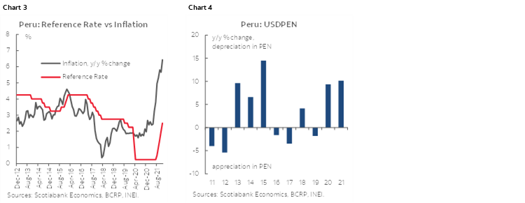 Inflation in 2021 ended at 6.43%, marginally below our forecast of 6.5% (chart 3). Although there are reasons to believe that inflation will moderate, especially early in 2022, it will take quite a bit for it to drop back into the BCRP target range of 1% to 3%. However, the appreciation of the PEN, which has already begun and may continue throughout Q1, will help stabilize prices (chart 4).