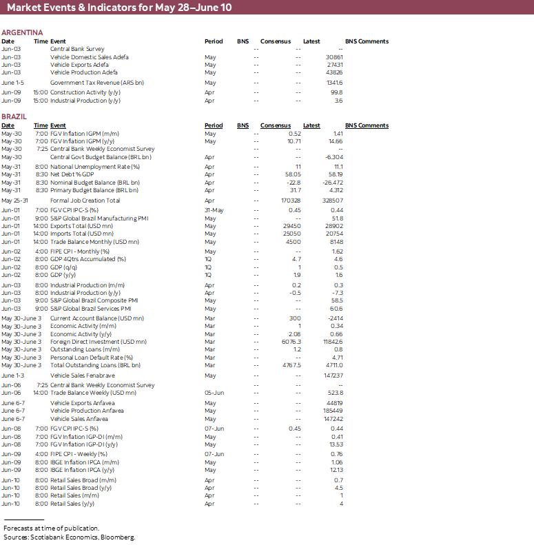 - A comprehensive risk calendar with selected highlights for the period May 28–June 10 across the Pacific Alliance countries, plus their regional neighbours Argentina and Brazil.