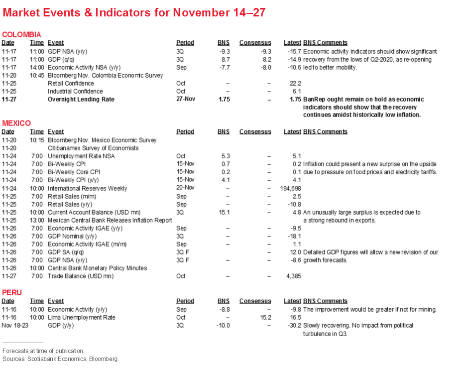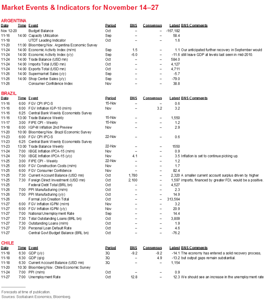 GDP data for Q3 are set to dominate macro-data risk events over the coming two weeks, with Q3 prints due from Colombia (Nov. 17), Chile (Nov. 18), and Peru (Nov. 18 to 23), with an update on preliminary estimates also due in Mexico (Nov. 26). Monthly GDP proxies for September are scheduled from Peru (Nov. 16), Argentina (Nov. 24), and Mexico (Nov. 26), though they’re of limited utility in Peru and Mexico since they arrive more or less contemporaneously with their Q3 GDP prints. Unsurprisingly after Q2’s disastrous numbers, we expect strong rebounds in Q3, but real GDP levels will remain between 6% and 15% below pre-pandemic levels across the Latam-6. See our Market Events & Indicators risk calendar at the back of this report for a full risk calendar.