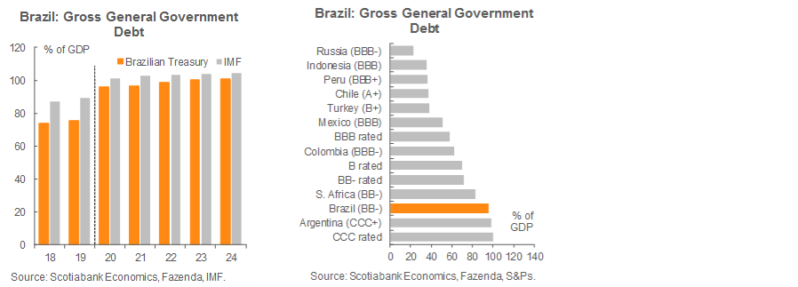 Depending on whether we go by IMF definitions and projections, or by the Brazilian Treasury’s, gross general government debt will peak at around 105% of GDP (IMF) or 100% of GDP (Treasury, first chart), both already at very high levels for an EM and consistent with junk-rated countries (second chart). Assuming an average cost of that debt of around 7% (380 bps less than the average 5yr rate for Brazilian government BRL nominal debt over the past 10 years), the combination of debt service and pensions would absorb about 25–30% of the public sector’s revenues. This makes a comprehensive fiscal reform urgent and suggests that fiscal space in Brazil is increasingly bumping against its ceiling. Another problem is growth. The Brazilian FinMin estimates the country’s potential growth rate at 2.5% y/y, which we see about 50 bps lower. Unless the country improves its potential, debt dynamics will likely continue to get more omplicated.