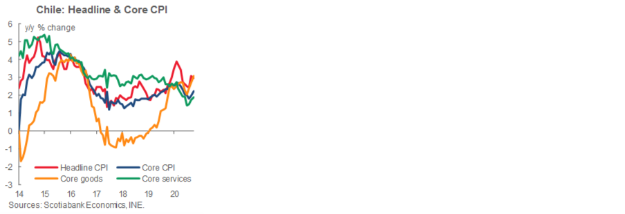 Chile. Inflation in Chile has been edged up for the next four quarters in response to October’s upside surprise. Still, we expect the BCCh to look through what we think is a transitory increase in prices driven by a temporary boost to consumption fueled by pension fund withdrawals and keep the policy rate on hold for several quarters.
