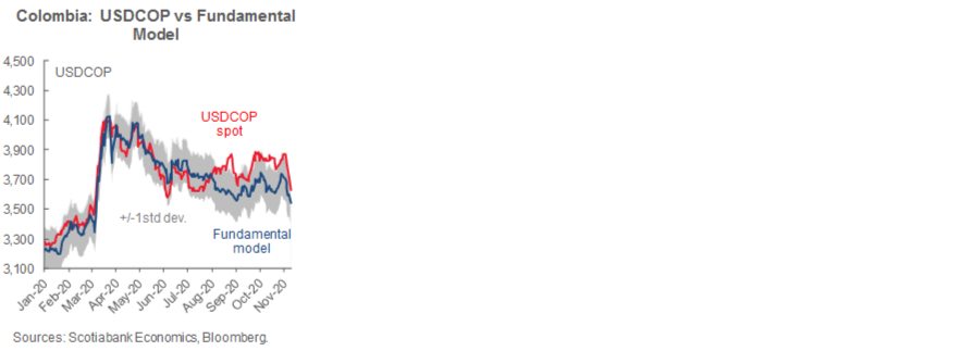 That said, structural arguments pointed to an FX equilibrium level higher than pre-pandemic expectations but lower than we saw in the pre-US election period. In fact, since August, the COP underperformed by 200 pesos on average from what our fundamental model suggests, something that we attribute to a non-measurable extra risk premium on emerging markets assets. However, it is worth emphasizing that—despite the US election results and vaccine announcement leading the USDCOP to an expected level—risks in the medium-term remain. Those risks are related to the COVID-19 second wave and what it could mean for the economic activity recovery, some geopolitical events in the region, and domestically, the remaining structural challenges for the fiscal consolidation.