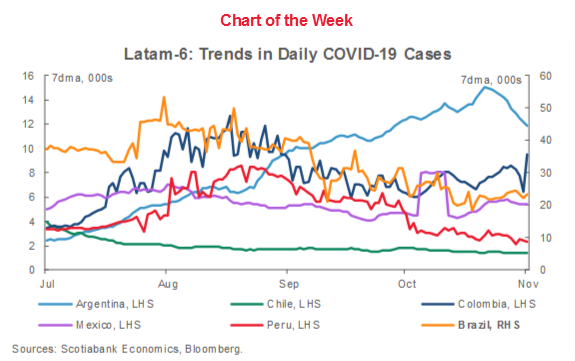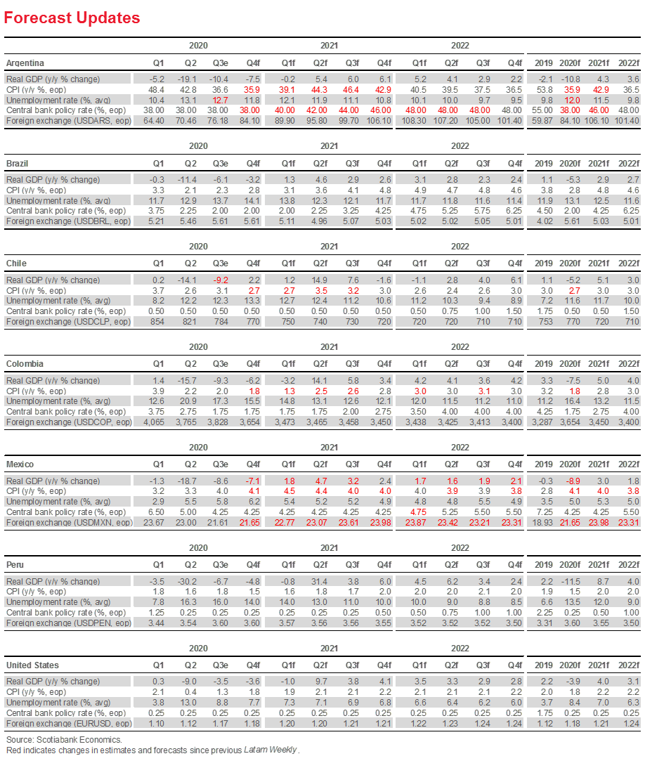 As the COVID-19 pandemic and Latam’s response to it continue to evolve, this edition of the Latam Weekly also marks some small shifts in our macroeconomic coverage of the region in response to requests from our readers. The Markets Report section has been hived off into a standalone publication that will be published on ScotiaView by our Latam Strategy team for institutional investors and corporate clients. Our Latam chart packs on the progress of the COVID-19 pandemic, key economic indicators, and market pricing will be updated fortnightly in a separate report from Scotia Economics for our Latam subscribers; it will also be posted on our public website.