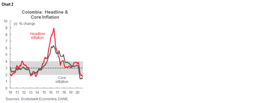 Since the October 30 meeting and the publication of the minutes and quarterly report, inflation surprised to the downside, slowing from 0.32% m/m in September to -0.06% m/m in October; this pulled annual inflation down from 1.97% y/y in September to 1.75% y/y, further below the 2% y/y to 4% y/y range around the 3% y/y target (chart 2). We expect the BanRep to look through this anomalous print. October inflation was dampened by one-off effects from a month of atypical data collection on post-secondary tuition fees that DANE doesn’t expect to be repeated in November. However, we could see further soft price prints in the short term owing to an extraordinary combination of a VAT holiday and some special programs to stimulate household consumption. Base effects could also bring down year-on-year inflation numbers in Q1-2021, but annual inflation rates are expected move consistently upward later in 2021.